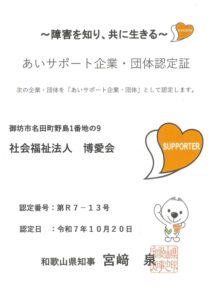 社会福祉法人博愛会が、10月20日付けで、和歌山県「あいサポート企業」に認定されました。これからも職員とともに「あいサポート運動」を進めていきます。